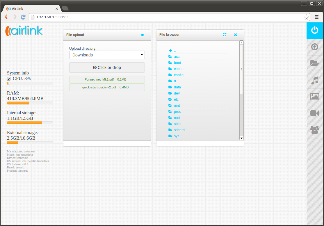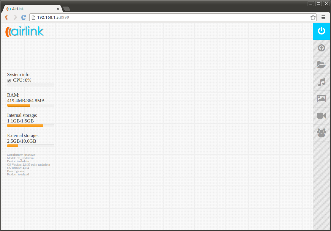 AirLink enables users to connect to their devices from a PC, Laptop or other devices using only a browser and a Wi-Fi connection. With AirLink users can securely browse device data, upload and download files, stream music and videos, monitor system information such as CPU, Memory & Disk Space in real-time.